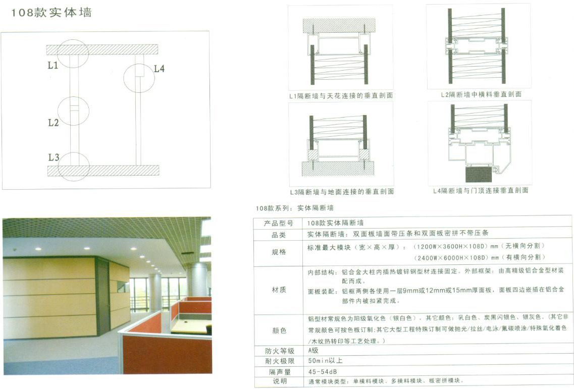 108款高隔断,厚度为108mm,它又分为108款单玻隔断和108款双面隔断,是目前东方华奥家具主推产品。面板跨度最大可达2400mm,玻璃跨度最大可达3200mm,高度可以做到6000mm,是东方华奥家具隔断墙系列里跨度分割和高度分割最大的一个系列。