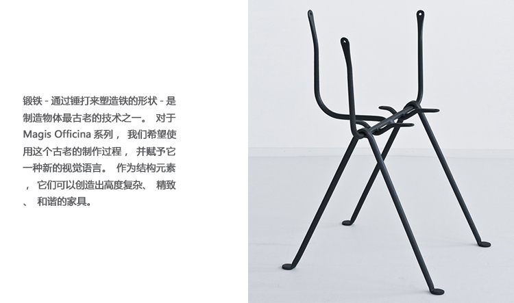 设计师Ronan和Erwan Bouroullec用办公椅庆祝这一古老的滴锻铁工艺。修长的腿是由锻造的铁条制成的,这些铁条在需要的时候被加热、弯曲、挤压或连接。一个轻微弯曲的座位和由聚丙烯或皮革制成的靠背被设置在顶部,创造了一个最小的设计来庆祝锤铁固有的不规则。