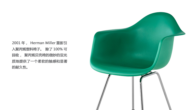 本单品为Eames Plastic Chair 系列成员之一,舒适的椅座外观设计是以添加了玻璃纤维强化的塑料来制作,再搭配上各式不同的脚座来增添使用的多样化,值得一提的是Eames Plastic Chair 的创新技术与材质,便它得以成为全世界第一张被大量制造的单椅。拜现今创新的科技所赐,全系列的Eames Plastic chair 终于再次制造,使用环保可回收的聚丙烯材质,求制作线条优美的椅座外壳,不但重量更轻,同时更具有更好的耐热性及抗化学性。