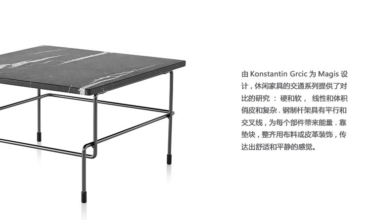 由Konstantin Grcic为Magis设计,休闲家具的交通系列提供了对比的研究:硬和软,线性和体积,俏皮和复杂。 钢制杆架具有平行和交叉线,为每个部件带来能量。 靠垫块,整齐地用布料或皮革装饰,传达出舒适和平静的感觉。