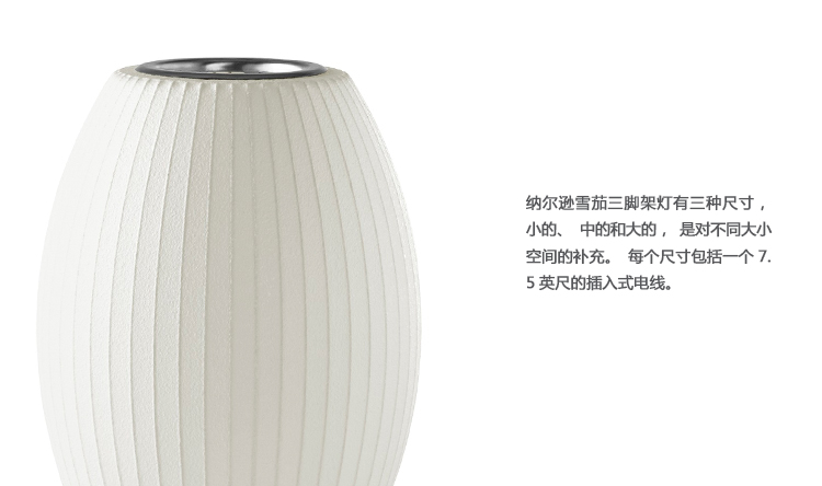 Nelson Cigar三脚架灯有三种尺寸,小型,中型和大型,可以搭配不同尺寸的空间。 每种尺寸包括一根7.5英尺的插入式电源线。 乔治·尼尔森于1952年首次设计了泡泡灯,当时他遇到了一个他希望为办公室购买的瑞典吊灯。 他受到昂贵的价格的挑战,并决定自己做。 结果是一系列具有元素,球形形状的灯,如圆形苹果,宽碟和梨形等。
