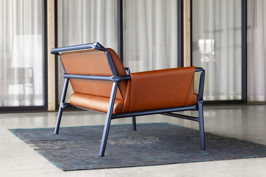 室内躺椅。漆过的“扭结”管状钢。聚氨酯泡沫填充。织物或皮革覆盖物。塑料支脚。座椅高度400毫米。总高度800毫米。总宽度755毫米。座椅深度522毫米。总深度843毫米。