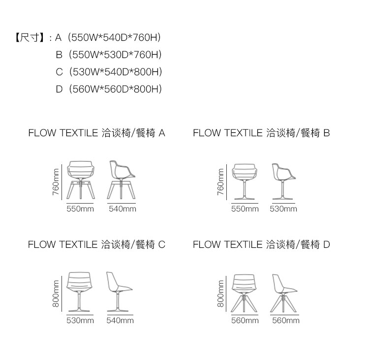FLOW TEXTILE 洽谈椅/餐椅 系列尺寸/示意图