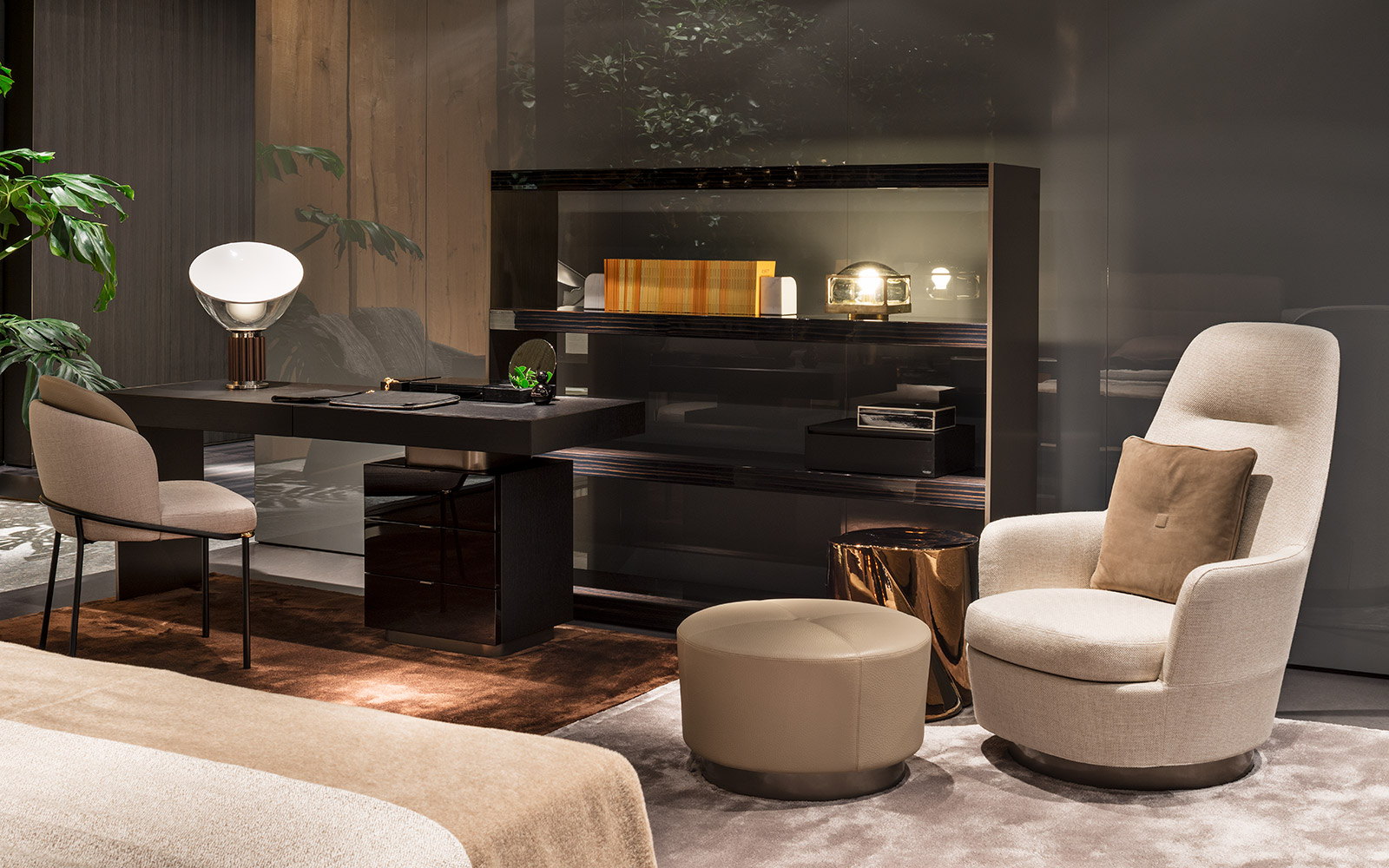 柔和的造型、紧凑的比例和具有视觉冲击力的细节呈现出精致的美学语言,金属基座采用淡铜色的表面设计。