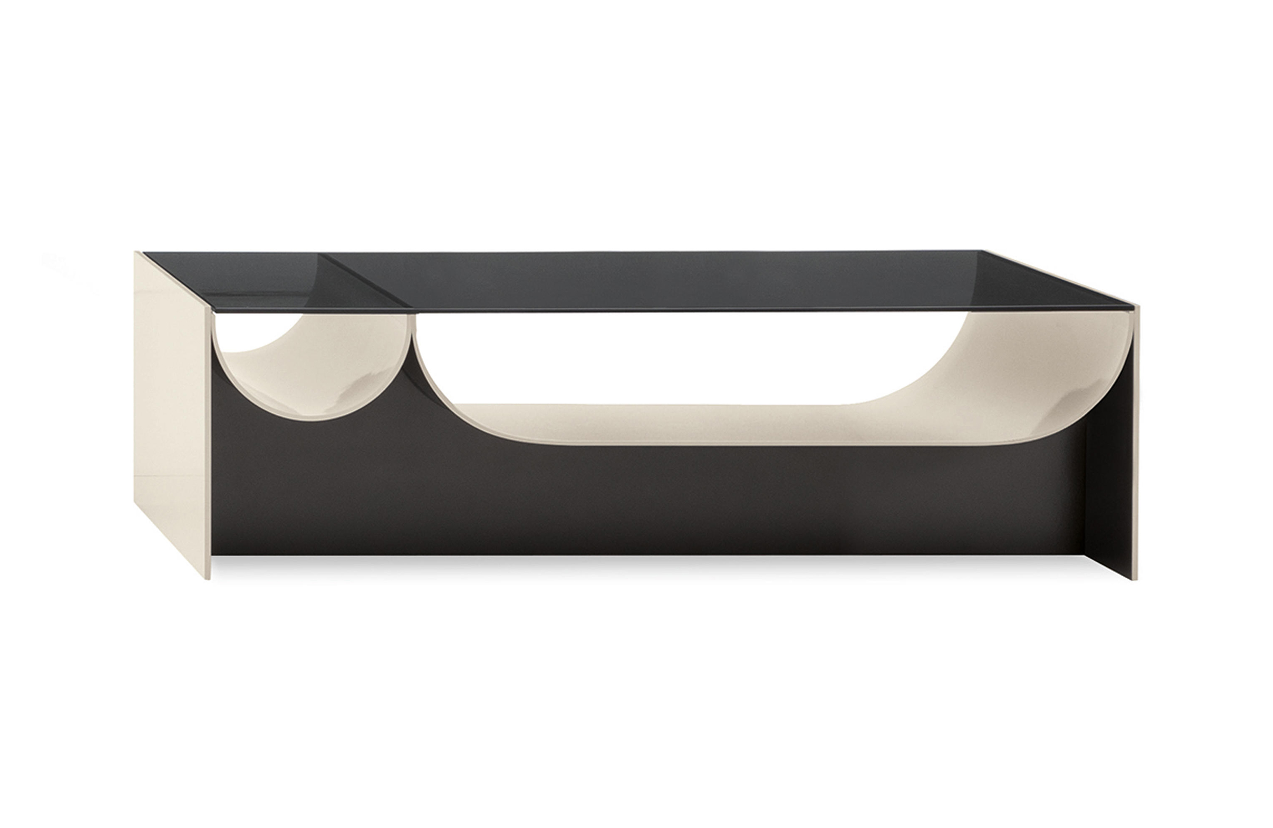 波浪咖啡桌是由一种烟熏的灰色玻璃制成的,它由一种漆成的铝结构支撑着,外面是一种沙子或浅青铜色的色调,里面有一种淡黄色的色调。