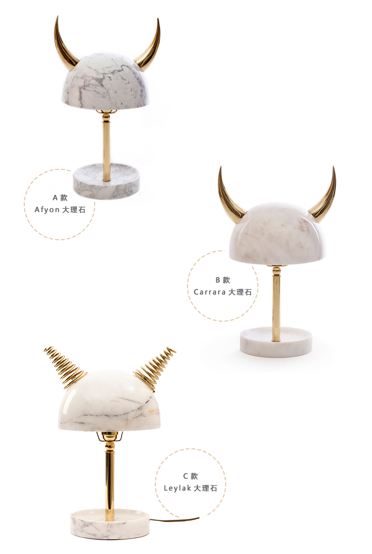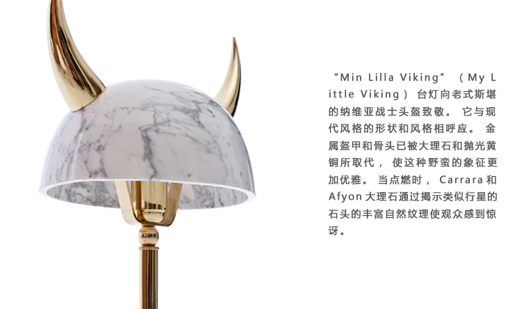 “Min Lilla Viking”(My Little Viking)台灯向老式斯堪的纳维亚战士头盔致敬。 它与现代风格的形状和风格相呼应。 金属盔甲和骨头已被大理石和抛光黄铜所取代,使这种野蛮的象征更加优雅。 当点燃时,Carrara和Afyon大理石通过揭示类似行星的石头的丰富自然纹理使观众感到惊讶。 “Min Lilla Viking”是将在不久的将来发布的一款严肃的漫画台灯中的第一款。