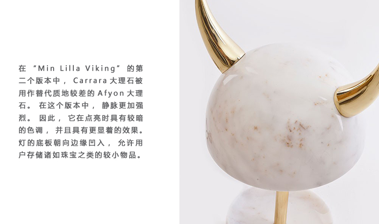 在“Min Lilla Viking”的第二个版本中,Carrara大理石被用作替代质地较差的Afyon大理石。 在这个版本中,静脉更加强烈。 因此,它在点亮时具有较暗的色调,并且具有更显着的效果。 灯的底板朝向边缘凹入,允许用户存储诸如珠宝之类的较小物品。