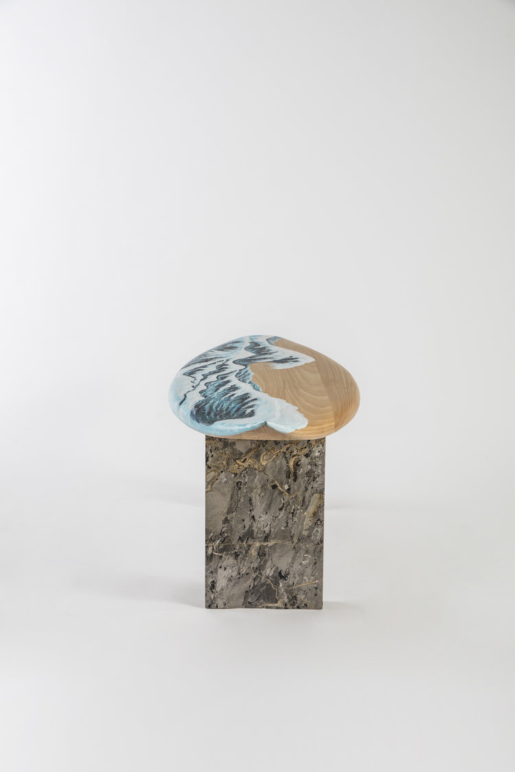 这条长凳的设计理念是:即使固定在固定的地方,也要不断移动。它结合了手工制作的石灰木和对比鲜明的大理石腿。座位是手绘的,让人想起神奈川的巨浪。