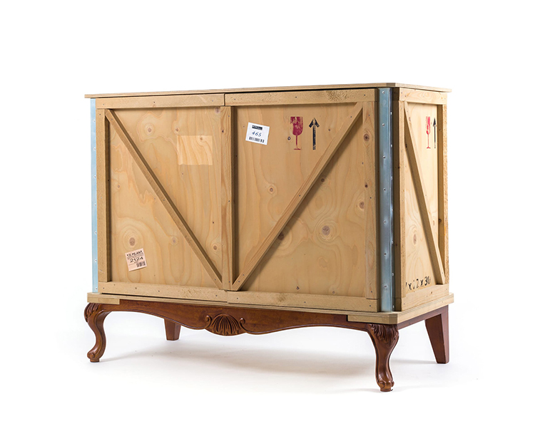 Designed by Marcantonio Raimondi Malerba for Seletti, this modern bedside table blends two different styles in one quirky design. A packing case boasting various labels and signs is paired with ornate Louis XIV legs. The bright green interior features one shelf and two storage spaces. Handmade from solid wood, this Export Como Bedside Table is as impressive in its durability as it is in its distinctive design. It can be used on its own to create a focal point in a bedroom or alongside other pieces of furniture from the Export Como collection. Made in Italy.
