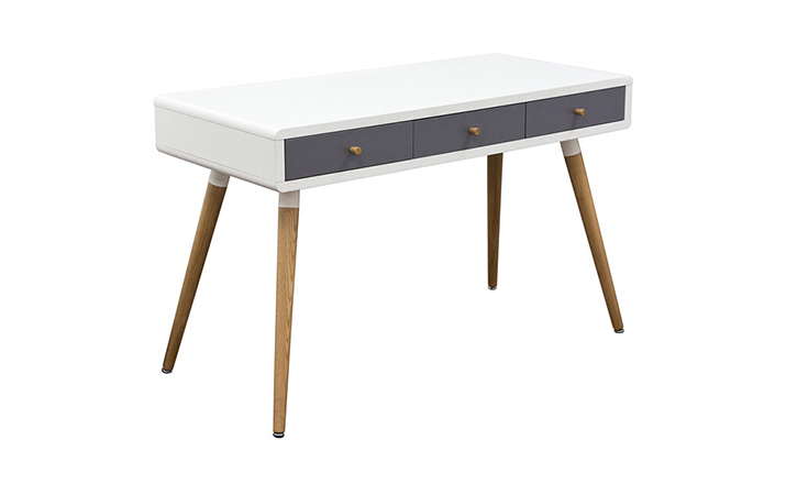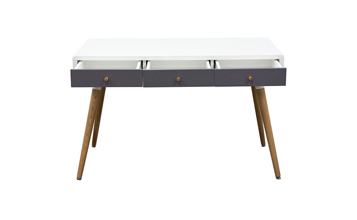 diamond sofa sonic writing desk(钻石沙发声波写字台)本世纪中叶复古声波3抽屉桌,为你家居的装修提供了时尚工作空间。起有着黑色橱柜和橡木抽屉前挡板,酷音效果时尚突出了固体橡树喇叭的腿设计,适用于家庭和工作办公。制作采用精选MDF板基材、进口胡桃或樱桃木皮贴面、实木脚架、彩色装饰边、环保净味油漆喷涂、做工精湛。