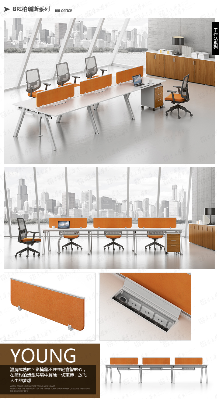 东方华奥潜心研究开发和主导整体的现代简约办公家具。柏瑞斯系列,在设计上承袭简约主义的精神内涵,以简练的线面构成营造一个单纯与干净的办公生活环境,表现出独特的纯净与凝练,营造出一个设计韵味机枪的办公环境。同时,柏瑞斯以温暖的阳光色调为主要基调,橙色宣扬一种阳光活力的精神,活泼、迷人中带有一点点现代与浪漫的碰撞后产生的时