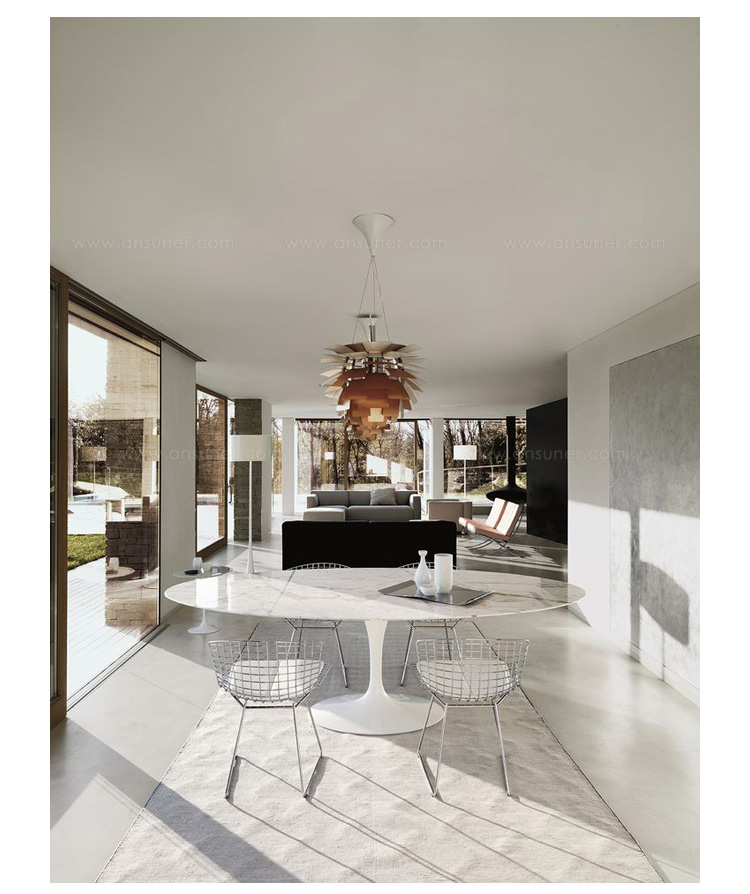 Tulip Dining Table(郁金香餐桌)是芬兰裔美国设计师Eero Saarinen在1956年设计的作品。优雅、清秀的桌脚配上天然的大理石桌面,极简却又完美。Tulip Dining Table(郁金香餐桌)是现代餐桌的代表作,作为家庭中使用餐桌、高档饭店中的餐桌和酒店中使用的餐桌都非常合适。作为著名家具设计师设计的作品设计品位自然不会低,这种餐桌设计出来的时候就被广泛的运用到了饭店、酒店和家庭中,成为当时最热销的餐桌之一,餐桌主要材料是玻璃钢(可选大理石),整张桌子是采用一次成型,中途不会出现裂缝,有质量保障,桌面平滑不会凹凸。