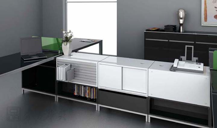 单元柜有标准的下文件柜、上文件柜、、电脑柜、衣柜可供配置,上文件柜又有软木背板、白板背板、铝沟槽背板可供选择。