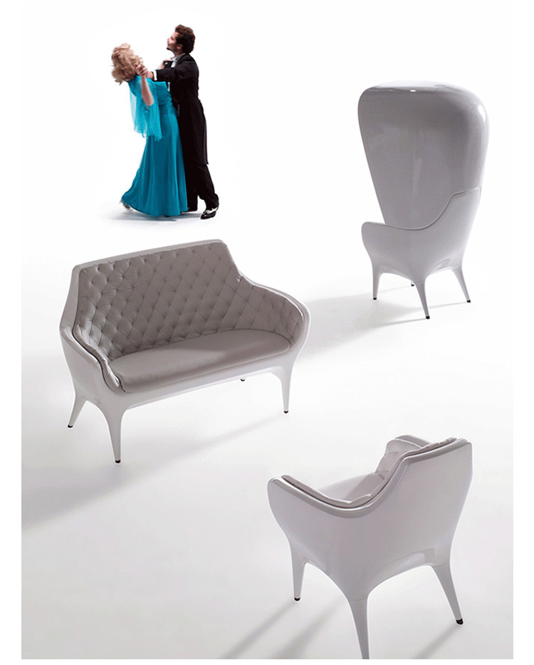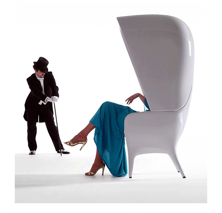 Showtime Hooded Armchair沙发系列是 Jaime Hayon 受邀与西班牙顶尖设计家具公司 BD Barcelona 合作推出的精品级艺术家具系列,灵感来自于米高梅歌舞剧场景,从单人沙发、双人沙发 发展到最具趣味性的圆顶高背沙发椅,让人坐进去就像是身处于古代欧洲戏院的包厢中,而外面的人只能看到一双伸出的腿,充满戏剧性的设计,不仅多了一份神秘感,,更令人不禁莞尔。