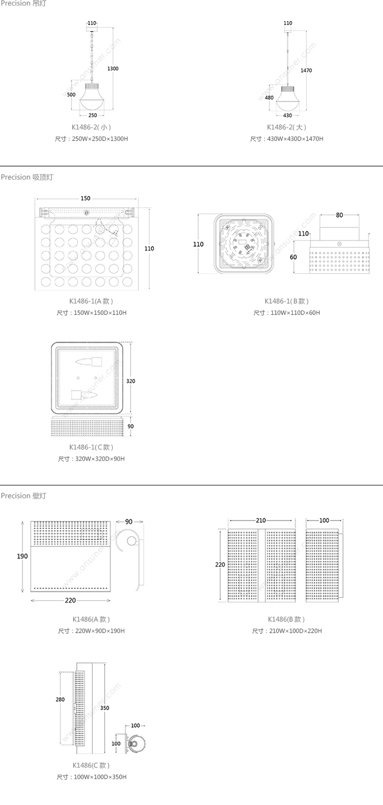 Precision 吊灯 系列尺寸/示意图
