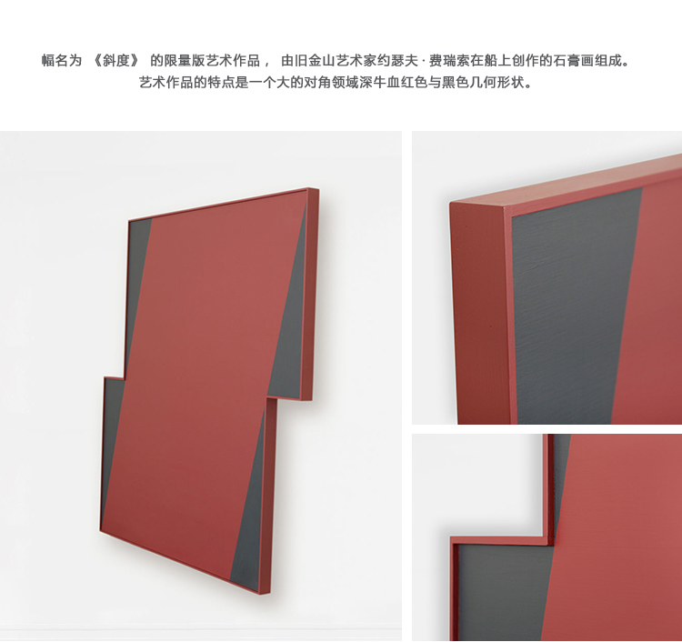 这幅名为《斜度》的限量版艺术作品,由旧金山艺术家约瑟夫·费瑞索在船上创作的石膏画组成。艺术作品的特点是一个大的对角领域深牛血红色与黑色几何形状。