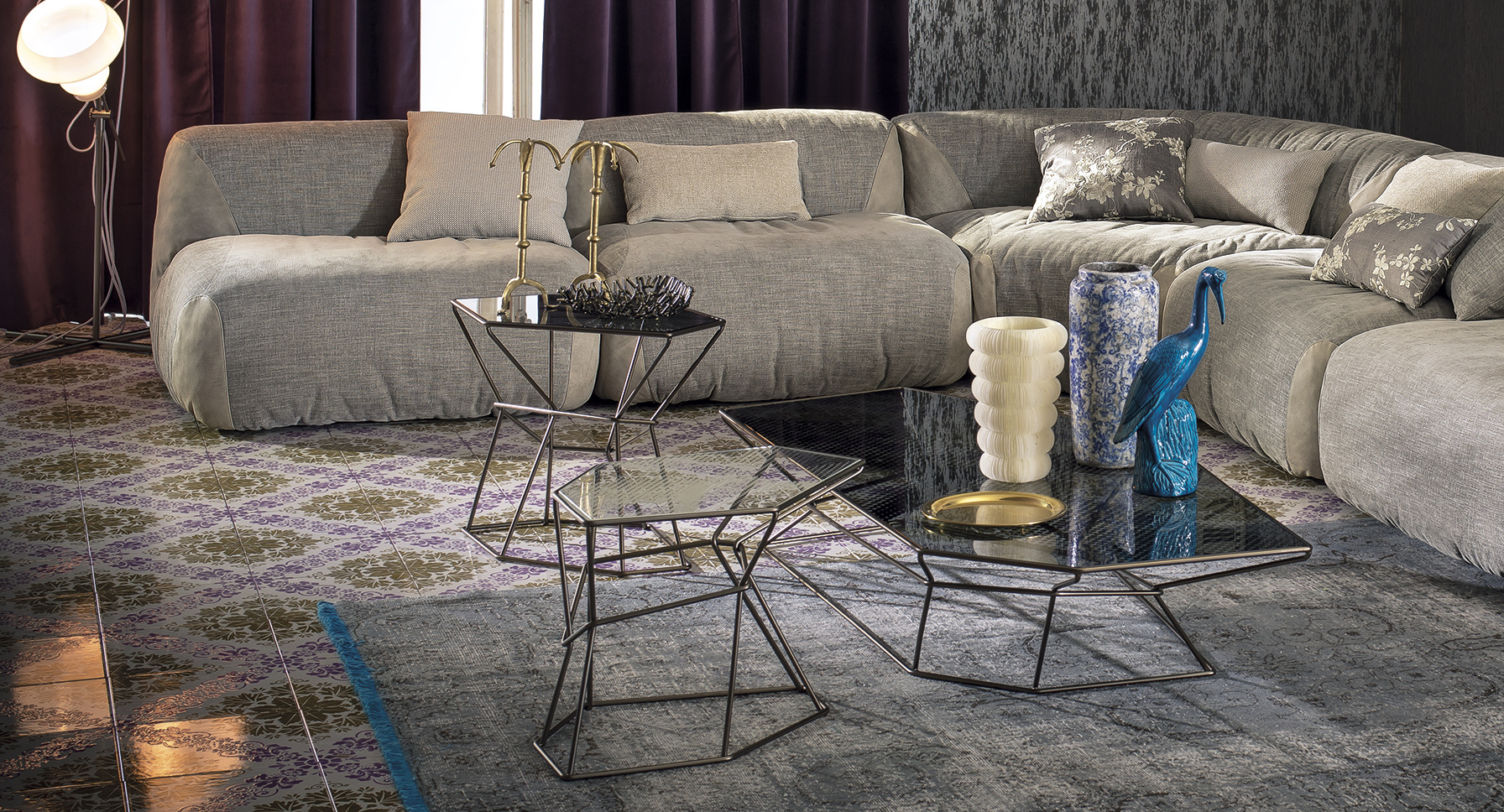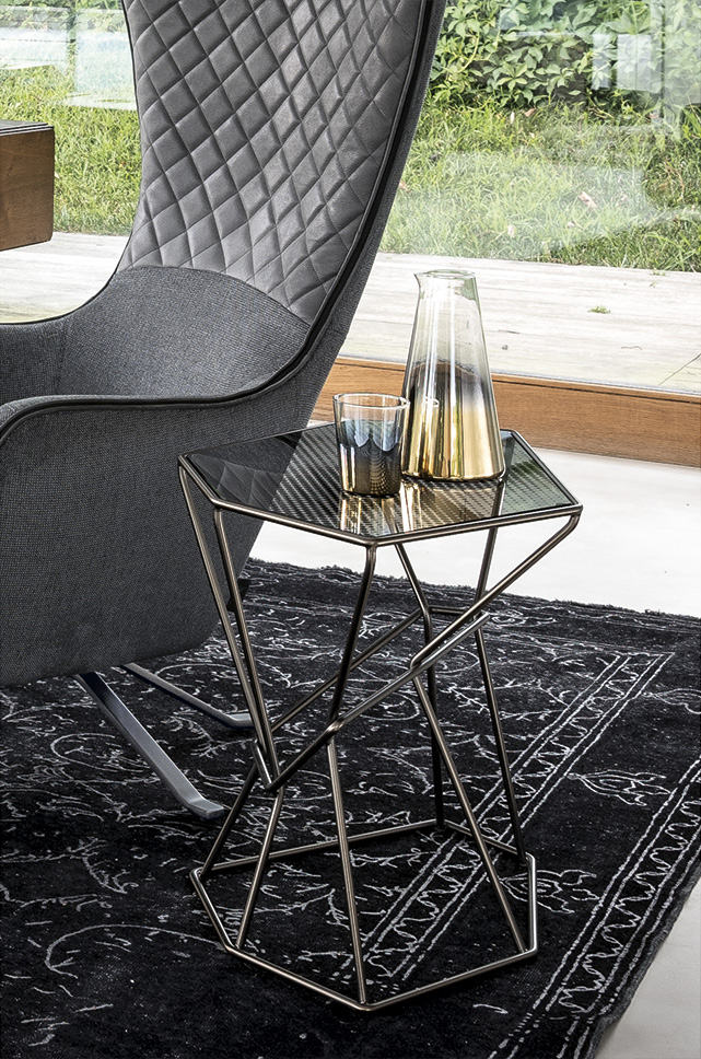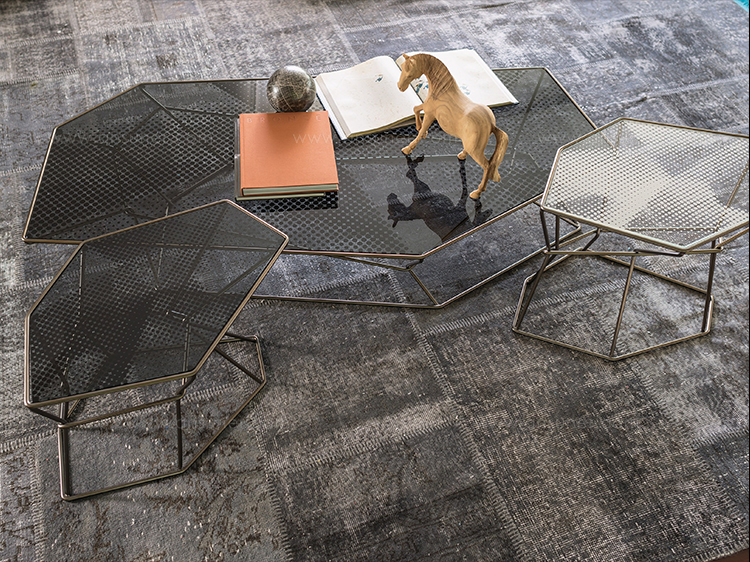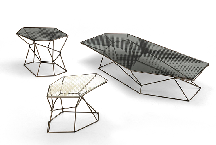 马洛·利帕利尼(Mauro Lipparini)的这款“倒车矮桌”(Rebus low tables)有金属结构,云母棕色的染色或镀锌的钛,以及一层金属丝的玻璃。结构和顶部都有不规则的形状,形成一种不寻常的交织。