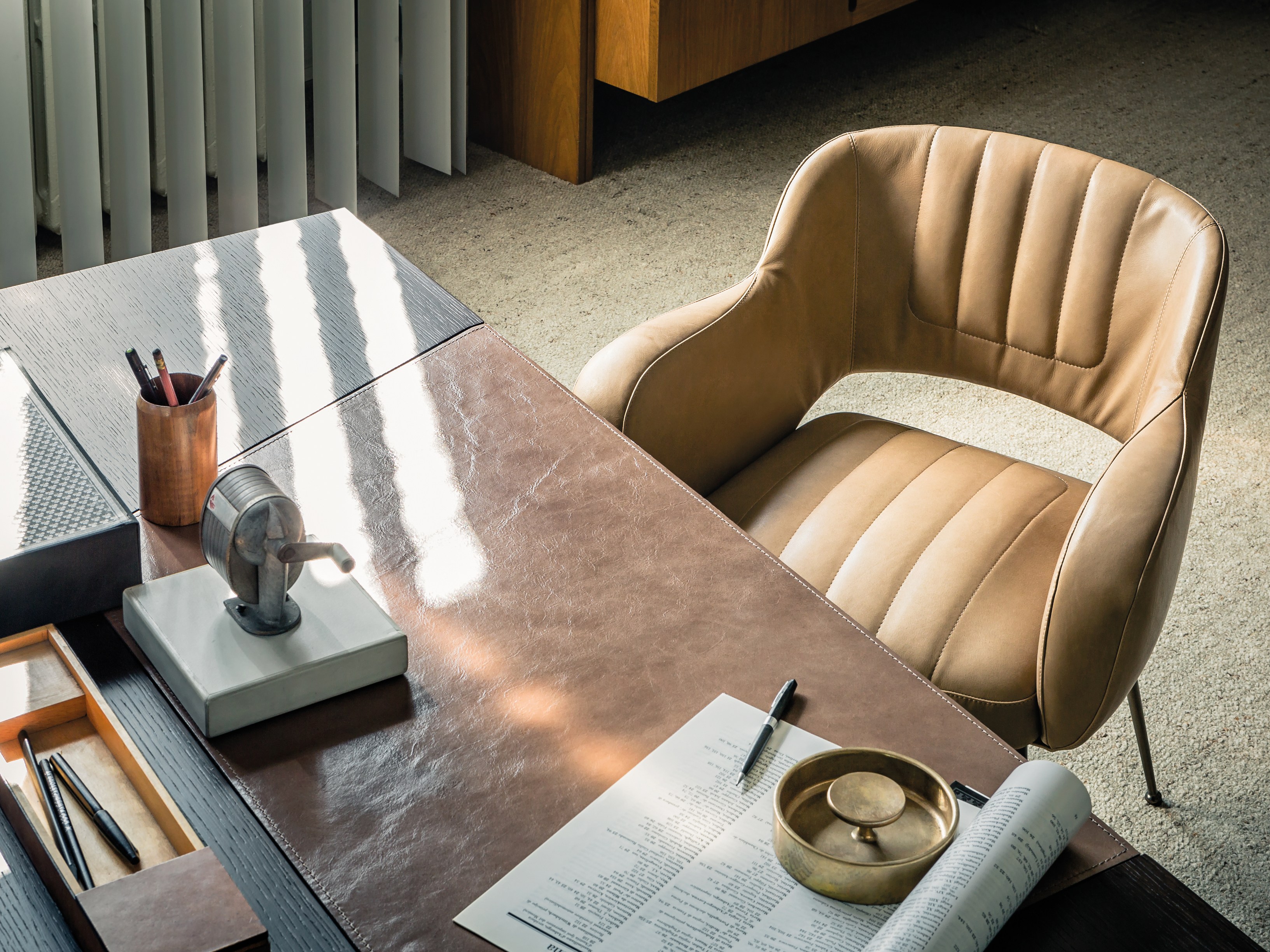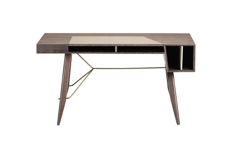 一个线性的、可适应的桌子,桌面配有皮革。这种金属镶嵌的纵横交错的底座让整个作品在纯粹的复古风格中增添了一种现代气息。抽屉的设计赋予了深度和功能,让它不仅是一个工作桌,还可以存放一些私密的文件。