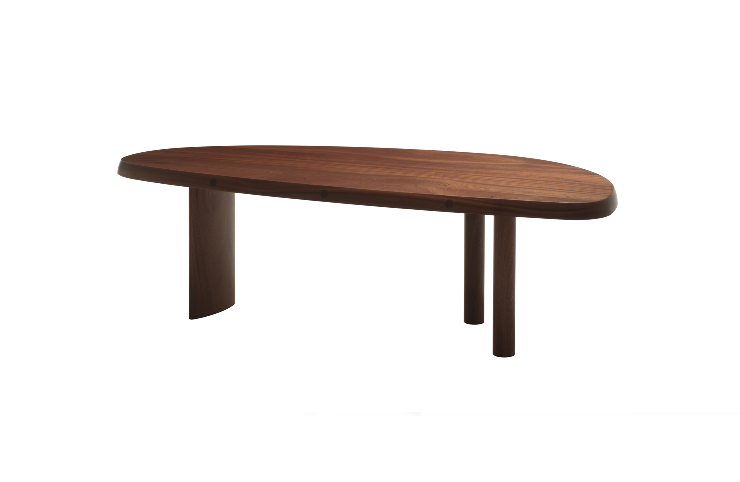 圆面实木面桌。构成桌面的木头拥有明显的侧接点。三条支撑桌腿,一条呈椭圆形的桌腿较大,链条圆柱形的桌腿较小。开孔黑漆橡木或桃花心木饰面。该系列的第一款桌子是于1938年为自己在Montparnasse的工作室设计的,圆形不对称的形状正好适于有限的空间,还突出制作桌子所用木头的天然美丽。因为这款桌子没有棱角,所以可以坐下许多人,是欢乐聚会的好选择。该款桌子采用经受外部因素变化的天然材料,例如:日照、温度、湿度和日常使用。在这款桌子中,不将此类变化视为不利因素,而将其视为材料的独特性,强调天然美丽。