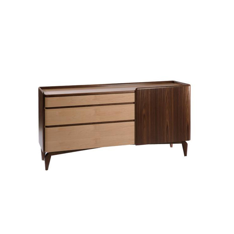 低柜造型现代优雅。低柜右侧门可从顶部打开,左侧有三个不同储存功能的抽屉。第一个抽屉可以放置珠宝首饰和珍贵物品,这层抽屉具有磁感应安全锁功能,具有防盗和防儿童攀爬倾倒功能,另外两个抽屉更大更深,为卧室提供更多的储存空间。