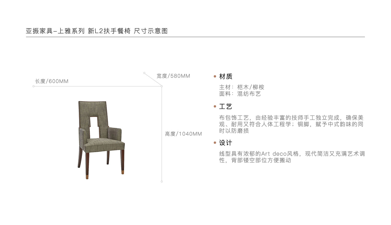 布包饰工艺,由经验丰富的技师手工独立完成,确保美观、耐用又符合人体工程学;铜脚,赋予中式韵味的同时以防磨损。线型具有浓郁的Art deco风格,现代简洁又充满艺术调性,背部镂空部位方便搬动。