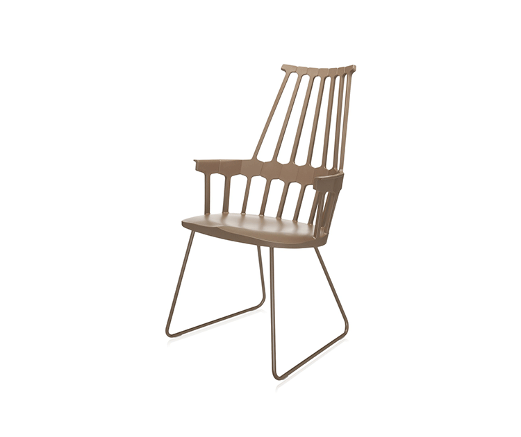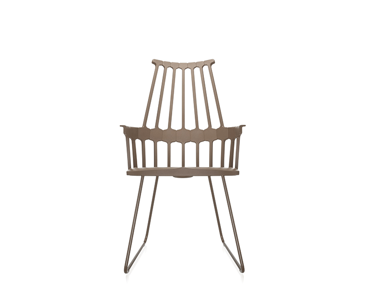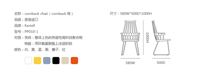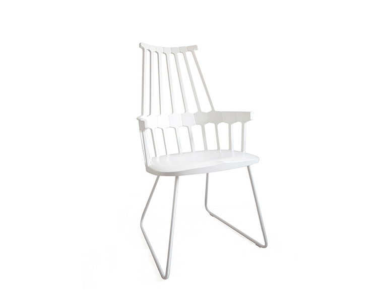 温莎风格椅被冠以乡村风格,但并非一成不变,在不同时期不同阶段又融入新的设计元素。Kartell的这款产品再一次享受重现经典的设计快乐,国际知名家居设计师Patricia Urquiola为温莎椅(Windsor Chair)打造了一个这款新的造型。回归十八世纪英格兰的辉煌时期“梳背”椅的特点,整个框架用亚光材质,靠背的7个分支结构朝着椅腰部位向下延伸,在一个加固六角形圆圈处与纤细的轴汇合,与椅座合为一体。聚碳酸酯材质的使用赋予COMBACK一种轻盈的质感和当代风格。浸透在黑色COMBACK梳背椅里的那一分淡定从容,能让人气定神闲,默默却又不留情面地将浮华虚荣隔在门外。因为不存在彩色光谱里,白色可以说并非真正色彩。纯白色Comback Chair梳背椅,唯美得让人难以抗拒。那种与世无争的清雅,好似刚刚落入凡尘的花瓣,昭示宁静与自然。这款Comback Chair 来自意大利的创新品牌Kartell,以发梳为灵感,回归18世纪英式风格,整齐对称的典雅扮相,表现出一份沉稳内敛的韵韵意涵。木质椅角的运用,让复古气息升华其中。配搭塑料椅身的现代风格特色,不愧为一份跨越历史的新时代作品。荣获2011年Wallpaper设计奖殊荣。