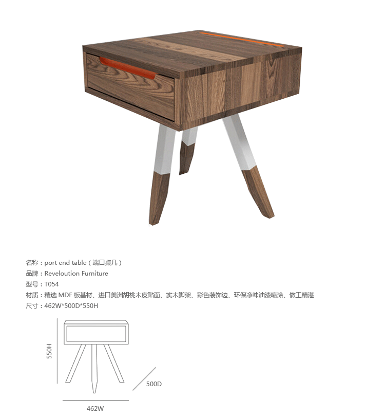 "port end table(端口桌几)可以适用于任何房间,它虽小但功能强大,简洁却又不失美观,造型新颖,别具一格。制作采用精选MDF板基材、进口美洲胡桃木皮贴面、实木脚架、彩色装饰边、环保净味油漆喷涂、做工精湛。"