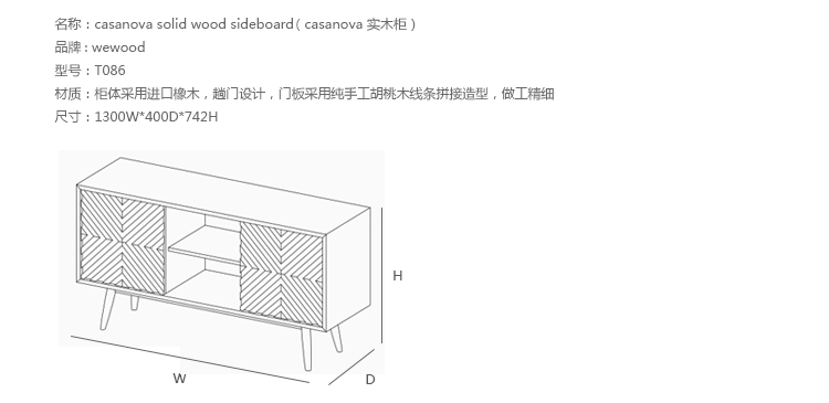 Casanova餐具柜:卡萨诺瓦是一块实木在100%,这可以是一个电视柜或简单地作为一个餐具柜。 门上的图案复制是由块橡木,胡桃木是固定的,熟练的工匠工作结合高质量的材料。 卡萨诺瓦是由五个空间:两个橱柜与滑动门,两个抽屉和一个开放的空间,两个可调节的架子,提供一个最佳的存储空间.