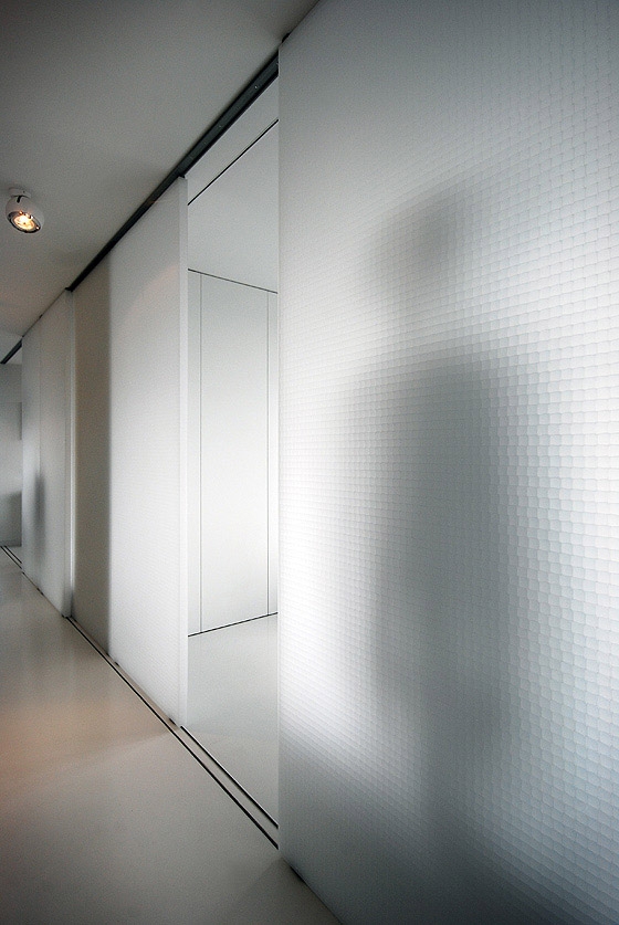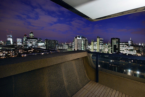 REFURBISHMENT OF A LISTED TOWER APARTMENT The flat is located above the city of London, only a short walk from the financial district amidst a on first sight, rough concrete oasis - the listed Barbican Centre. There is no traffic, instead ponds, gardens and a distinguished cultural centre on the ground level, including a concert hall, theatres, art galleries and cinemas. The 100 m² flat on the 17th floor of the Shakespeare Tower with spectacular view over the roofs of the city shall be the new residence of our client and also serve as an exhibition space. When the client purchased the flat it looked as if it was frozen in time with yellowed carpeting and the original kitchenette, albeit seemingly run down. Nevertheless the flat had a well arranged floor plan, although the corridor, kitchen and bathroom were located towards the inside of the building and therefore appeared dark and small. A Loggia stretches all around the flat. On the east side in front of the kitchen window it forms a terrace which offers unobstructed views over the skyline. From breakfast with the sunrise to an evening sunset it is only a few steps along the balcony. The flat shall become more flexible and spacious while maintaining the historic floor plan. Space for the display of contemporary art shall also be offered. The panoramic view must be visible from all corners of the flat. In order to achieve a greater lightness, the wall between the corridor and bedrooms was replaced by translucent sliding panels. Living rooms are completely coloured in white to underline their spaciousness and to form a minimalistic background for the art collection. In harsh contrast to this, the walls of the internal spaces of the corridor, bathroom and kitchen are coated with a smooth shimmering black cement finish. The dark finish allows small rooms to work larger and adds an elegance with the contrast to the white fixtures. The structure of the flat with its three layers becomes visible: the outside loggia, the white living rooms and the bathroom and kitchen completely wrapped in black. The solid wall between the bathroom and corridor was also removed and replaced by translucent sliding doors. When open, the owner can enjoy the panoramic view while soaking in the bathtub. If the balcony doors are also open, the gentle rumble of the metropolis can also be heard. The Barbican Estate was built between 1965 and 1976, on a site that was bombed in World War II.The complex was designed by the architects Chamberlin, Powell and Bon. The estate was officially opened in 1969 and is now home to around 4,000 people living in 2,014 flats. The flats reflect the widespread use in Britain in the 1960s and 1970s of concrete as the visible face of the building. "The intention underlying our design is to create a coherent residential precinct in which people can live both conveniently and with pleasure. Despite its high density the layout is spacious: the buildings and the space between them are composed in such a way as to create a clear sense of order without monotony. Uninterrupted by road traffic (which is kept separate from pedestrian circulation through and about the neighbourhood) a quiet precinct will be created in which people will be able to move about freely enjoying constantly changing perspectives or terraces, lawns, trees and flowers seen against the background or the new buildings or reflected in the ornamental lake." Chamberlin, Powell & Bon, Architects "Barbican Redevelopment" April 1959