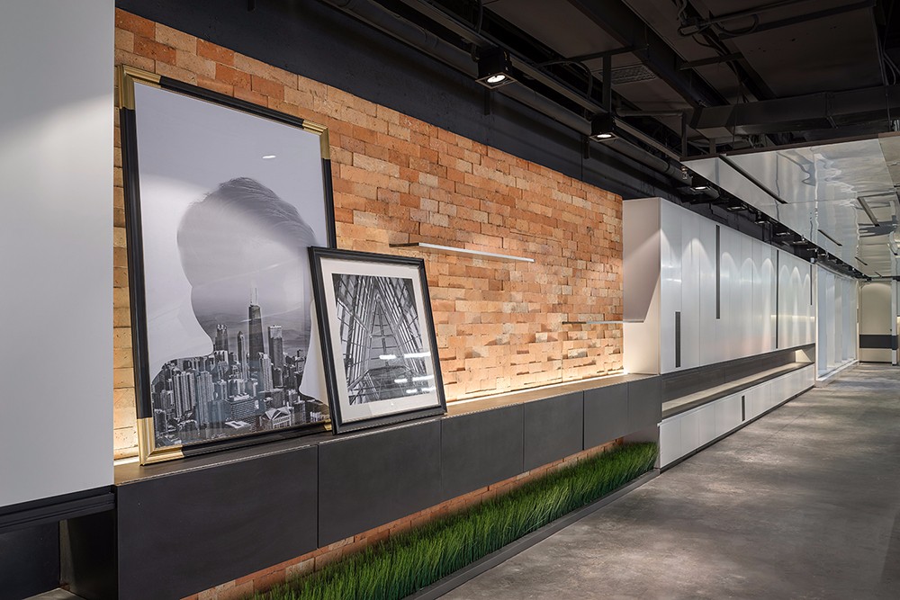 如同宇宙般的黑色在本案中获得淋漓尽致的使用,接待台背景墙,大面积的黑色天花裸露,还原物理肌理的地面。以象征自然系的木色,搭配少许工业感的现代简约风格,给人自然质朴的感觉。