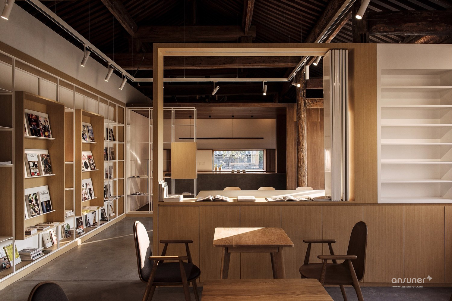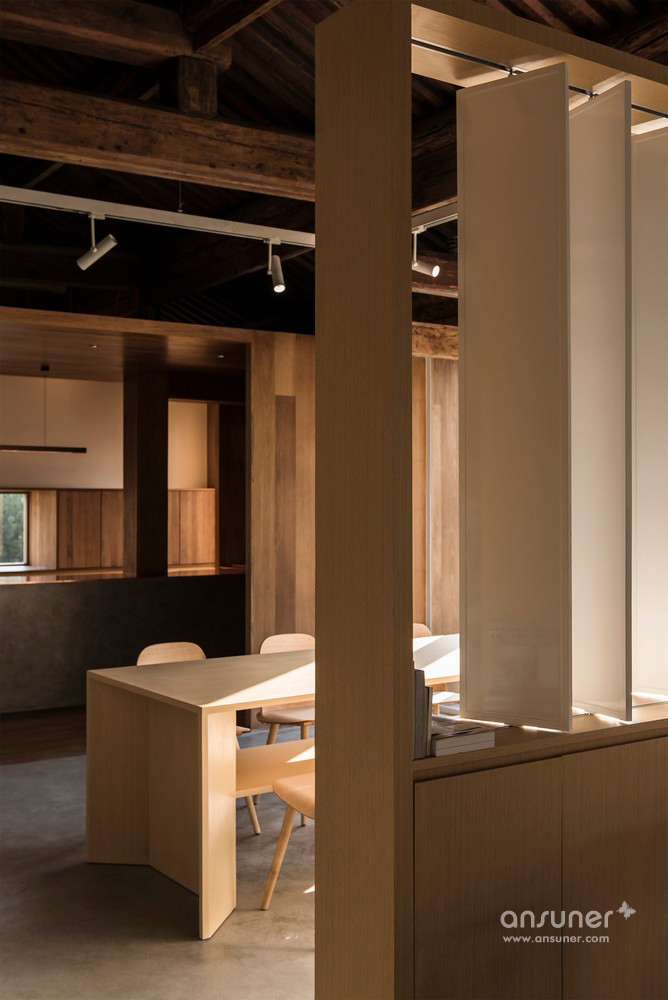 在灰色水磨石的连接下,沿河的立面用节奏较为舒缓的矩形体块排布开来。其中主入口连接了室内吧台区域,将它们组合在一个盒子当中嵌入房间,形成了简洁明确的功能划分。为书籍展示和阅读讨论设计的大工作桌放置于敞亮的玻璃窗旁,停留在此能感受饱满和谐的阳光和窗外恰到好处的小河垂柳。西侧格栅折叠窗设计巧妙地在回应传统装饰语言的同时也可用于夏日遮阳。