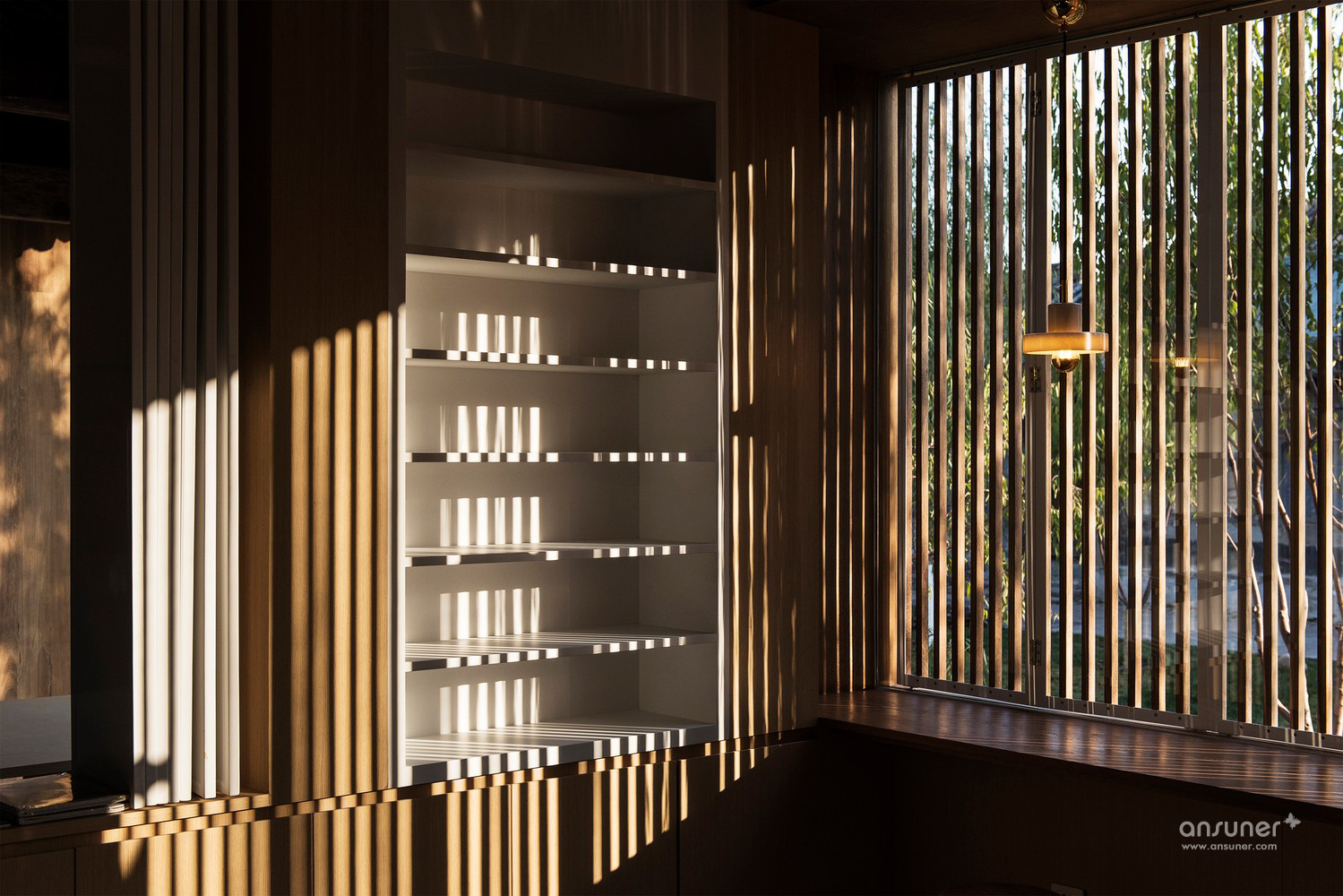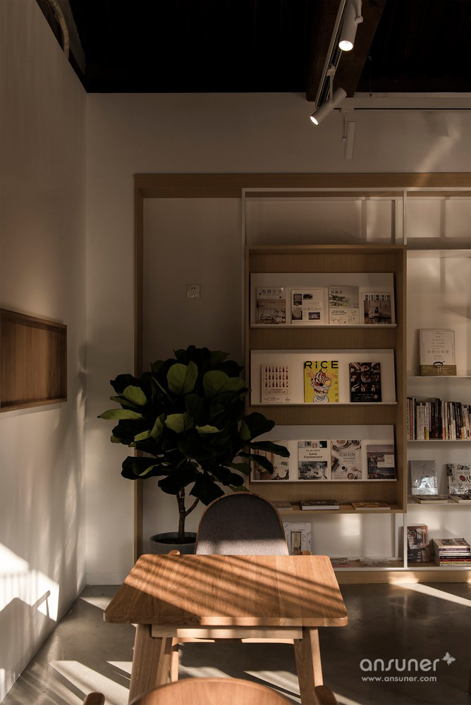 书籍展示和分类是阅读之前的序曲。步入屋内,人们的视觉焦点自然转移至书架区,轻盈的白色钢板和木盒子的组合在空间内尤为醒目,各色书刊在尺寸不一的格架中向读者呈现。我们试图在紧凑的格局中营造松弛有序的体验,来此的书友在踱步、发呆或聚精会神的时刻都能找到合适的空间。目光移至吧桌区域,阳光透过竖向格栅和长条窗挤入室内,在不同材质间流动,触手可及。