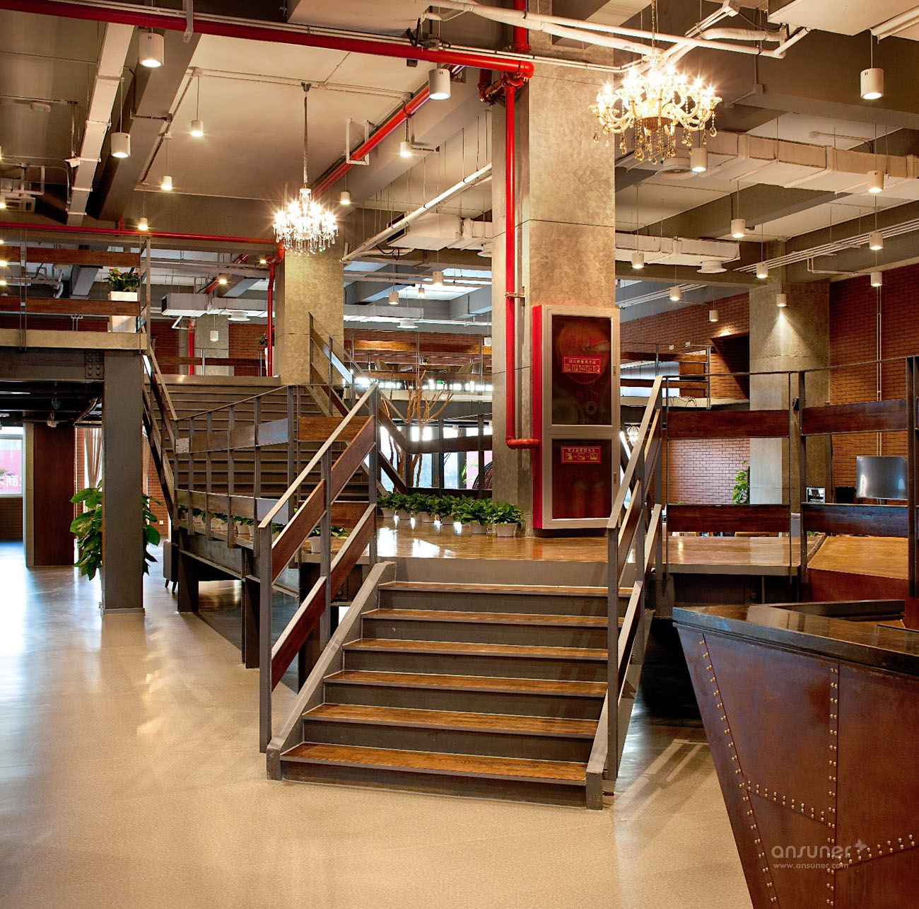 入口处醒目的大红色门厅,墙壁饰面采用集装箱纹理,与接待台后的木色饰面即形成了鲜明对比,同时又烘托出了温暖、开放的环境氛围,独特的工业风格特色让人第一眼就留下深刻印象。铁制的接待台经过特殊锈化处理,展现出了斑驳仿旧的视觉效果。