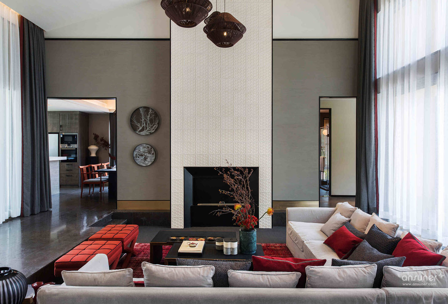 客厅:软装设计上,色彩浓重与用材粗放的矛盾组合,不拘一格,在隐藏的静室之下掺杂了强烈而又煽情的色彩视觉。细节处低调嵌入优雅的中国传统纹样,以打破重组的独特手法,在空间里造成恰当的碰撞,粗粝的花樽中,娇俏的花枝摇曳,明艳中还带有丝丝缕缕的纯真。