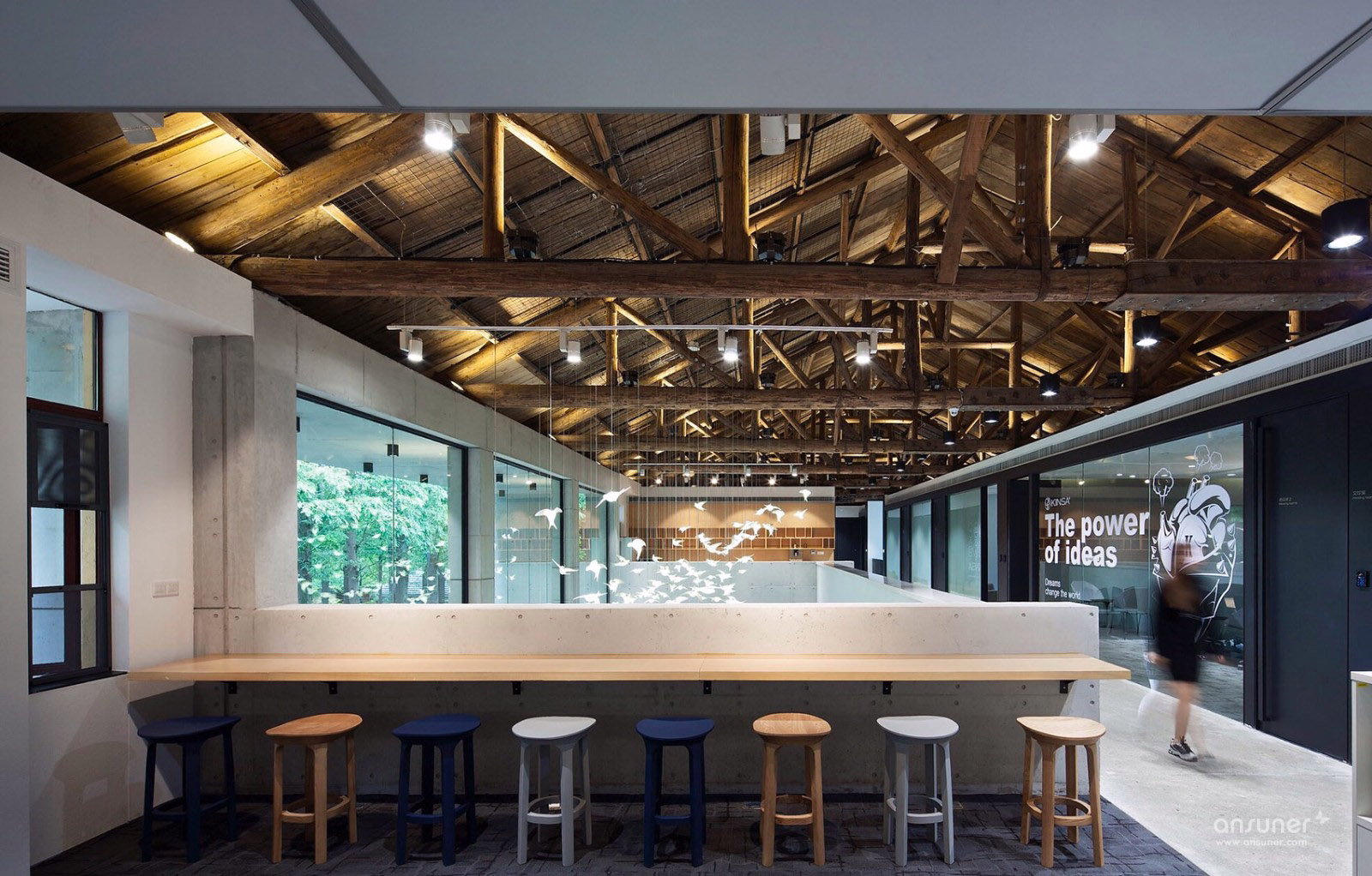 望板上的屋漏痕在诉说着一件件精彩的故事,经历了时间洗礼的望板,仿如一面宋画的绢布背景,若在望板上稍加点缀,寥寥数笔生灵与之交流,便可以形成一幅宋画意向,同时也与项目甲方诉求吻合,整个空间要有家的感觉。燕归巢是对家最贴切的诠释。我们的设计策略是对老建筑的精神延续与衍生,保持原有建筑空间的质量,而不是生猛的冲突。木桁架经过时间的洗礼,斑驳中有时间的印迹,与树脂板建筑材料之间的微妙碰撞,造就了时光交错的印象。我们寻找原来的建筑结构的逻辑,增加剪力墙与柱梁来对原有墙面与屋顶进行加固。同样利用了清水混凝土做结构并摒弃装饰面,让建筑语言之间交流更为流畅。建筑与自然之间的有趣的边界称之为灰空间,建筑的主入口正是这样的模糊边界空间。水杉树庭院与室外庭院,主入口之间形成这种叙事关系。