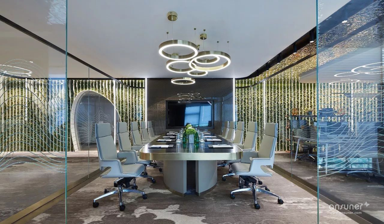 经理室融入会议功能,提高会议效率的同时大大的节约了功能空间。书吧区域可利用休息时间进行充电,让办公更具人性化,气泡式智能会议功能让办公环境更具科技感,设置互动讨论区可随时进行头脑风暴,座位对应墙面配置视频电视可随时转换为会议模式。