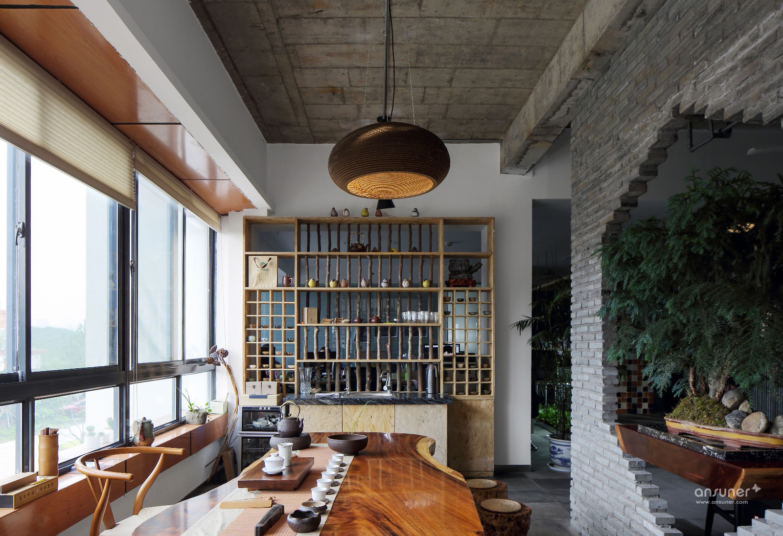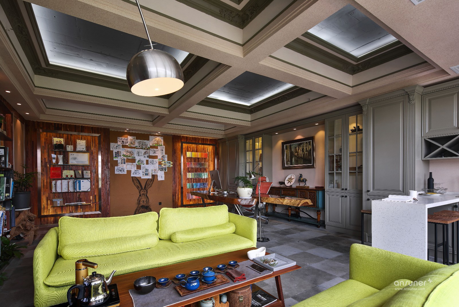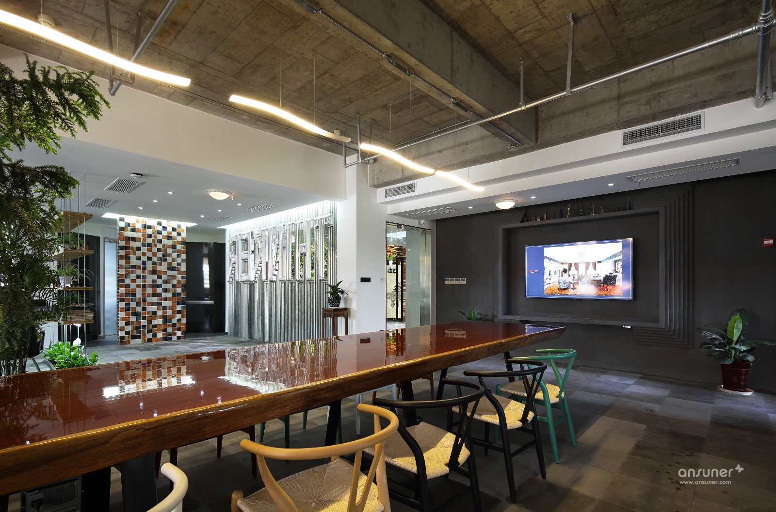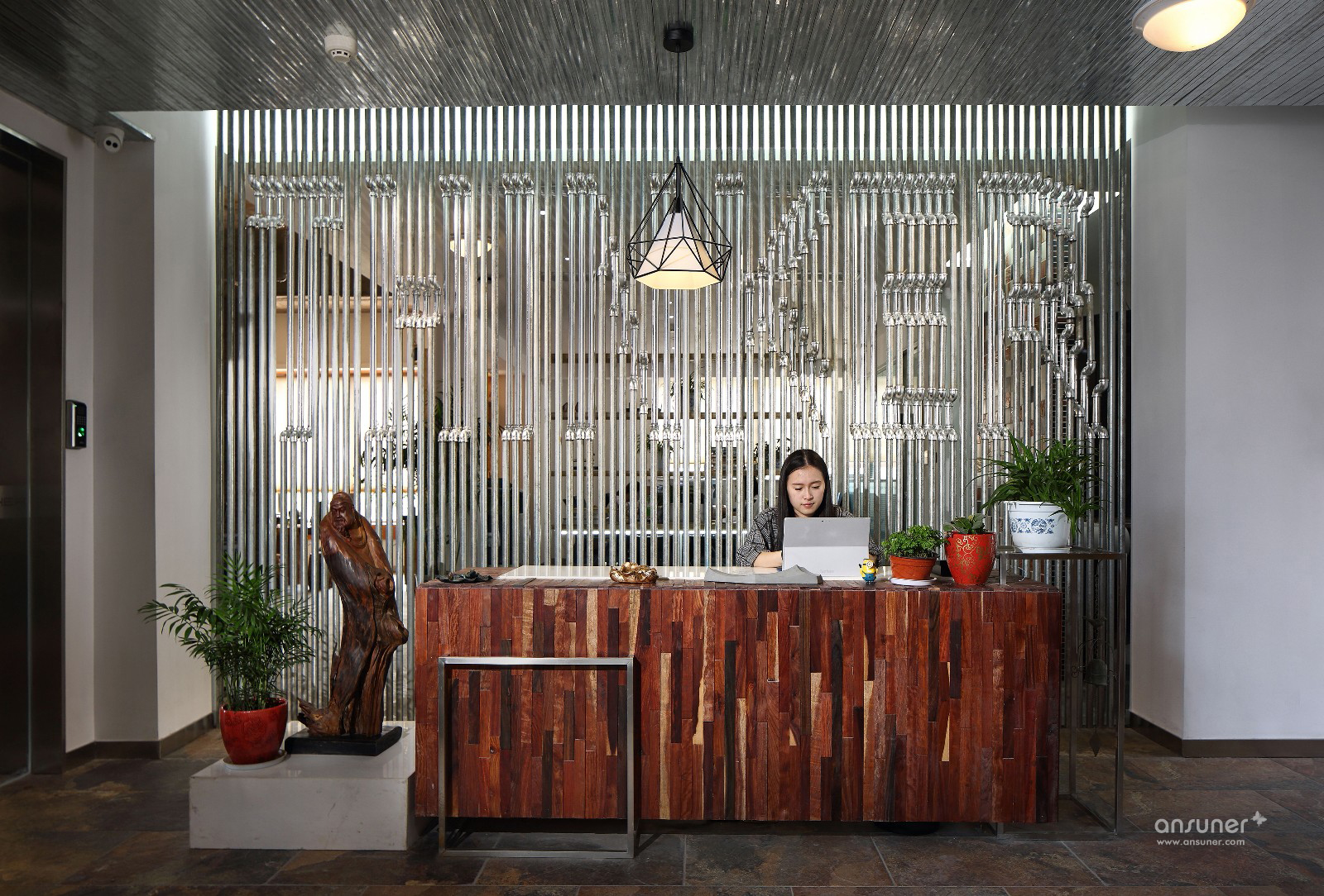 各种文化的碰撞,各种材质的尝试,尤其是废旧材料的利用,讲究环保与节能,绿色装修,自然古朴。会议区与交通区域融合,达到节约空间的目的。公司LOGO背景寓意为设计师通过敏捷的设计能力,让思想闪光。
