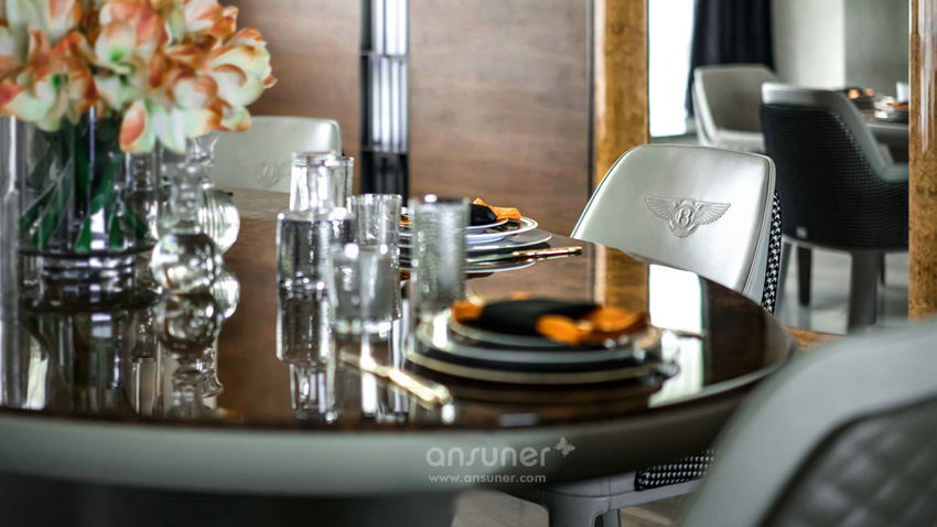 璀璨的水晶吊灯,做工精致的皮沙发,独具特色的茶几,Bentley经典的菱形格纹,点缀其间的大卫挂画,在同一空间,形成独到的艺术氛围与审美气度。而空间中的饰品,则在每一个细节上将低调奢华演绎得淋漓尽致。