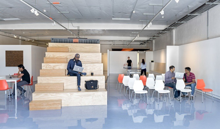 最近开放其在帕罗奥图5千平方英尺的独立办公盒子,其实就是一个多孔的“盒子”,这个“盒子”占据了约一半场地大小,容纳了天井、独立办公室、大小会议室、排练室、后勤辅助等所有内向性房间,在 “盒子”上开孔,这些“孔”成为被墙体分隔的空间之间的纽带,创造一个灵活、互动、平等、趣味的空间氛围,以激发员工的创新力。