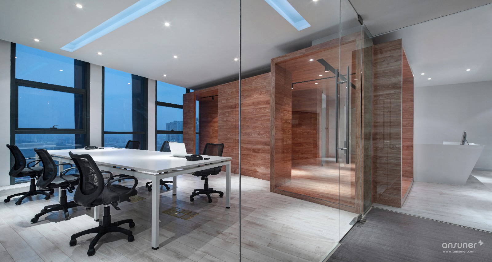 盒子,一个简单的元素.。但在这里,它却是最大的价值体现者。封闭的盒子组合成两条不规则的过道,串联起每一个功能区。会议室采用大面积透明玻璃隔墙,显得通透且敞亮。整个空间以白色调为主,这与公司的文化保持一致,也与木色地板整包的“盒子”相得益彰。灯光,在满足照明的情况下,每盏灯都像是一颗随意丢出的石子,随意而不刻意!总之整个设计没有循规蹈矩,既满足了办公需要,又令使用者可以在里面愉悦的工作。