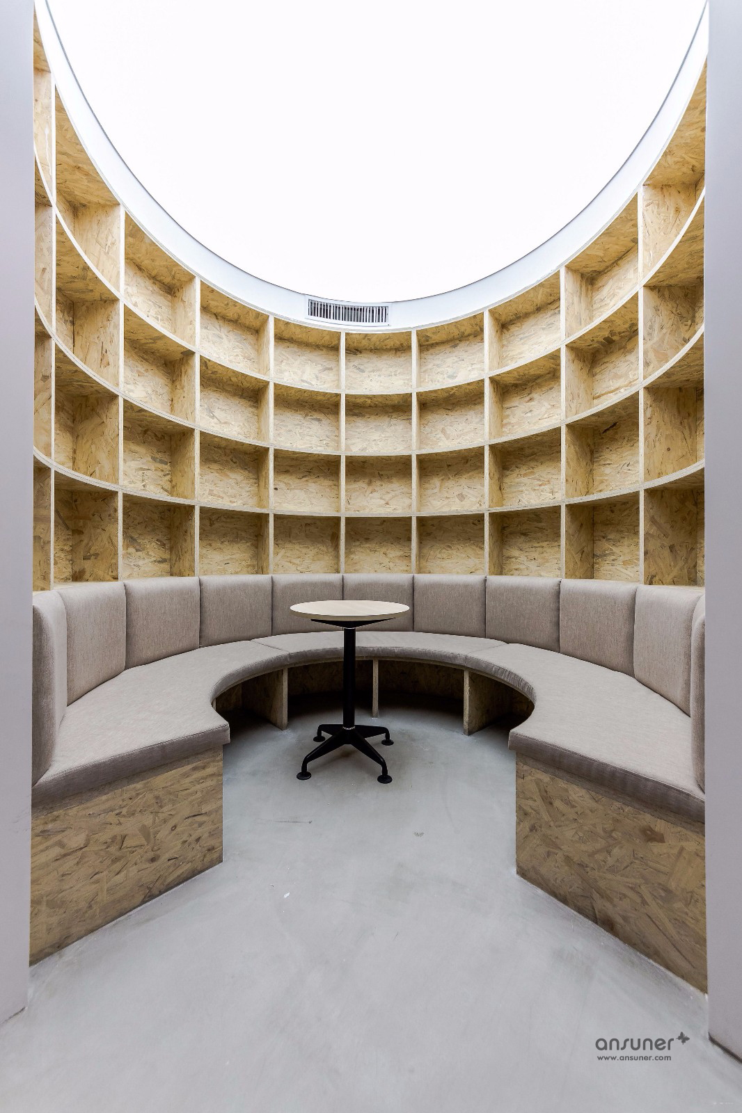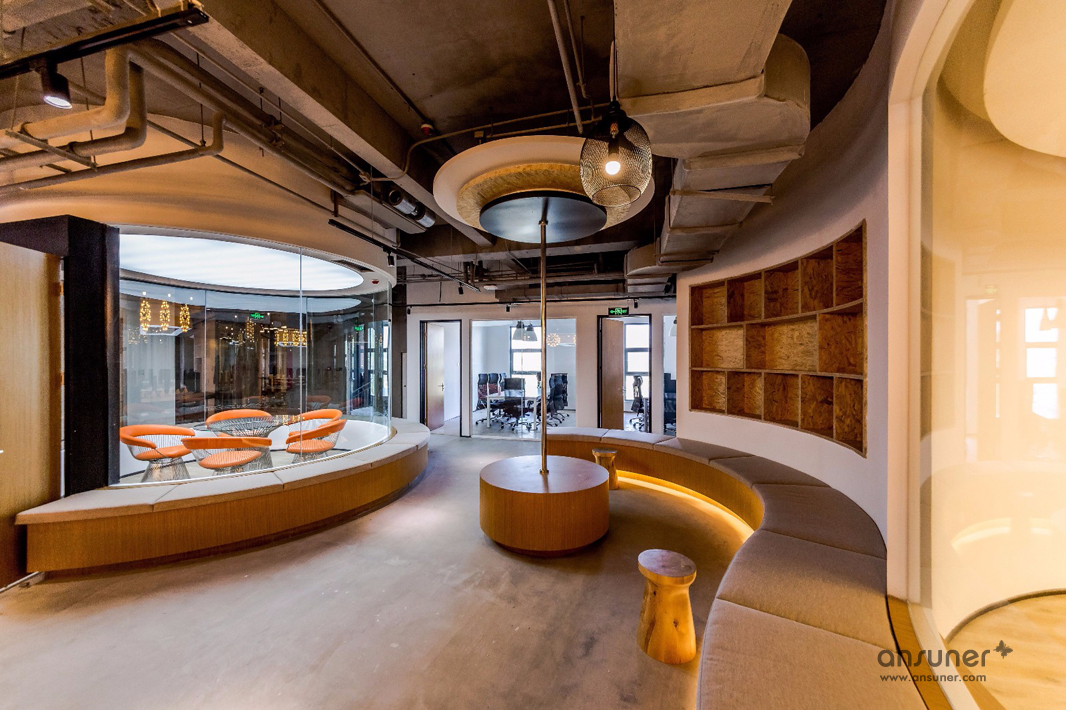 圆弧形的会议室和休闲区是本次设计的核心,也是凸显共享和交融的重点,通透的玻璃会议室和无遮拦的休闲区设计形成完美的结合。休闲区的设计得益于当今的科技发展,移动式办公成为可能。标注办公桌渐渐转化为共享办公桌,多元化的移动办公方式提供了更丰富的选择。个人固定办公桌时代已经成为过去,员工要考虑的事情就是选择哪里更合适今天的心情、今天的工作。
