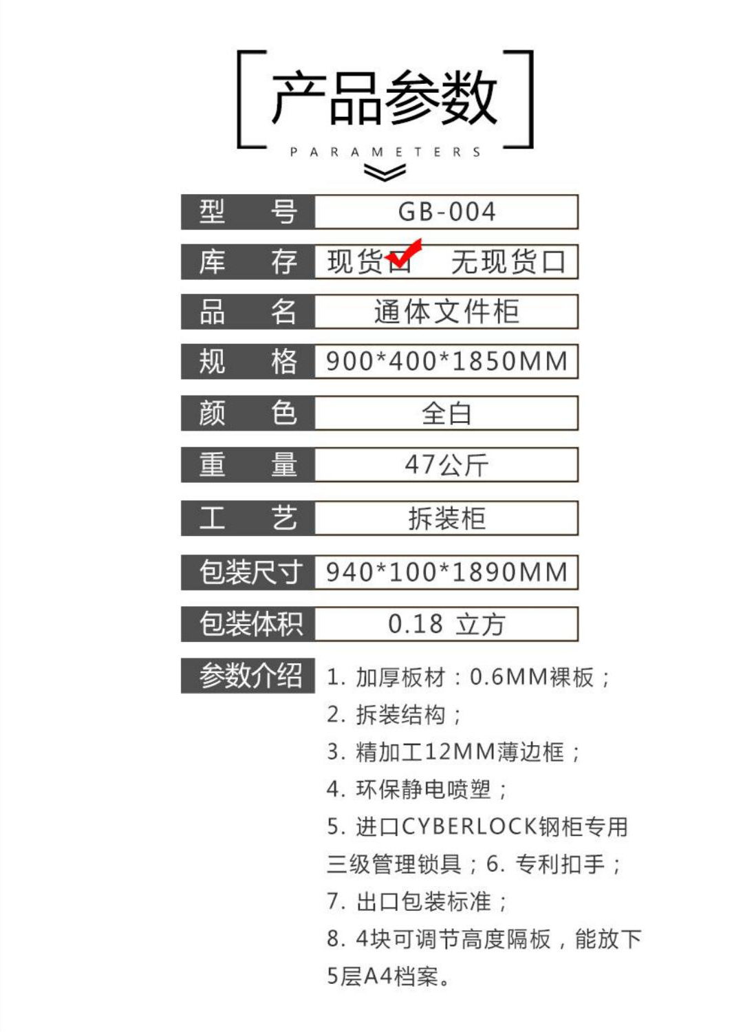 1加厚板材:0.6MM裸板 2.拆装结构; 3精加工12MM薄边框; 4.环保静电喷塑: 5进口CYBERLOCK钢柜专用 三级管理锁具;6.专利扣手; 7.出口包装标准; 8.4块可调节高度隔板,能放下5层A4档案.